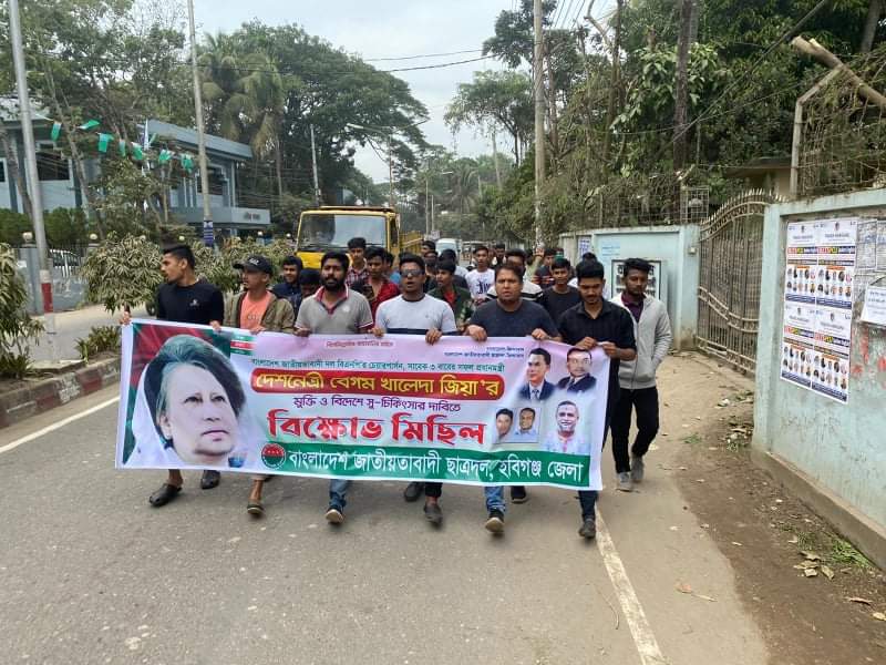 বেগম খালেদা জিয়ার মুক্তির দাবিতে ছাত্রদল নেতা সৈয়দ আশরাফ এর নেতৃত্বে হবিগঞ্জে ছাত্রদলের বিক্ষোভ মিছিল।
