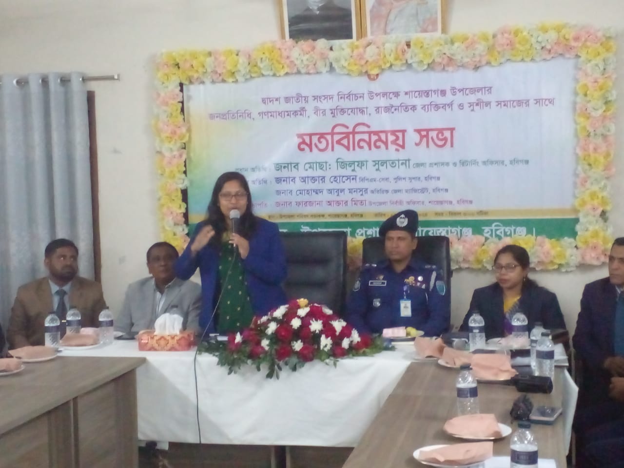 দ্বাদশ জাতীয় সংসদ নির্বাচন উপলক্ষে হবিগঞ্জের শায়েস্তাগঞ্জ উপজেলায় জনপ্রতিনিধি, গণমাধ্যমকর্মী,বীর মুক্তিযোদ্ধা, রাজনৈতিক ব্যক্তিবর্গ ও সুশীল সমাজের ব্যক্তি বর্গের সাথে এক মতবিনিময় সভা অনুষ্ঠিত হয়েছে।